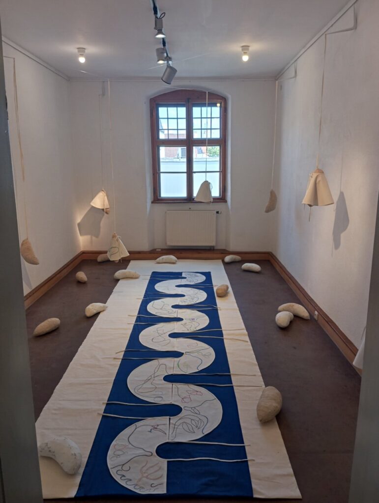 Raum Achtsamkeit: Achtsamkeit, 2023, Installation, mehrteilig, BW bestickt, Pappmaché, variabel
