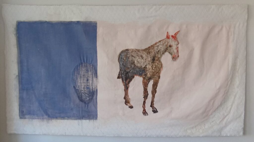 Raum Wandel: o.T., 2024, Oel auf BW, bestickt, unterlegt mit Vliseline, 120x225cm